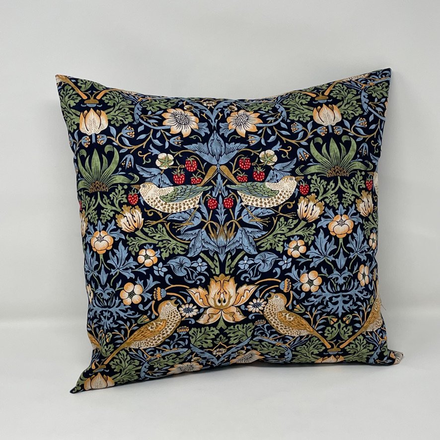 Handmade envelope cushion in a William Morris Strawberry Thief printed fabric design. Perfect for lovers of the Arts and Crafts movement, birds or strawberries!
